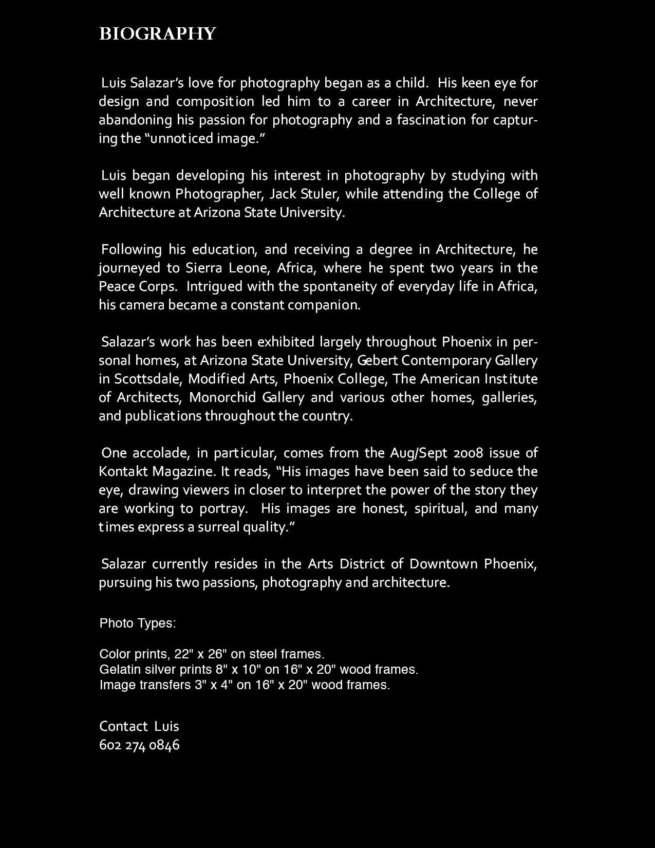 Exhibit & Contact Information | Studies in Infrared and Black and White | Fugue in Dark and Light | Unraveled II | Unraveled | Nudes Oscura | Fantasmas | Africa | Environment | All Roads | Miscellaneous | Salazar Architects